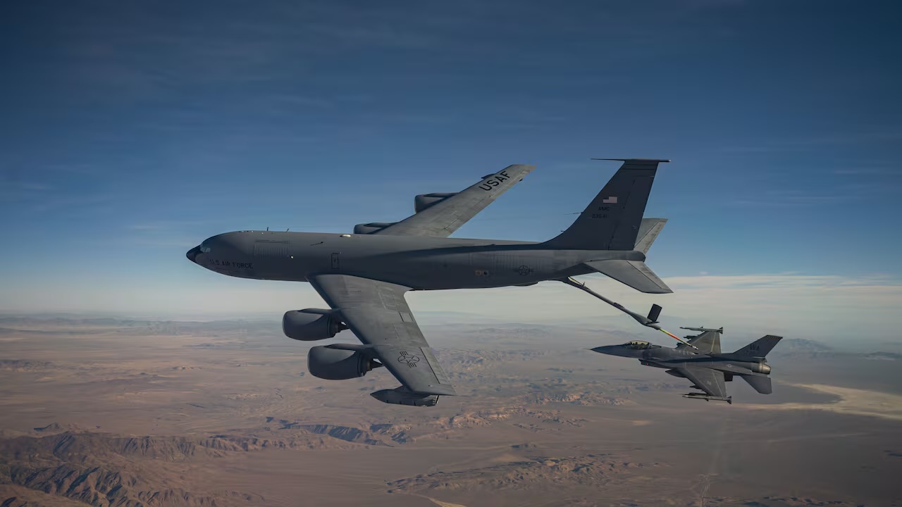 El KC-135 es efectivamente una estación de servicio voladora que permite a los aviones reabastecerse de combustible en el cielo para ampliar su alcance y permanecer dentro de una zona de batalla durante más tiempo.